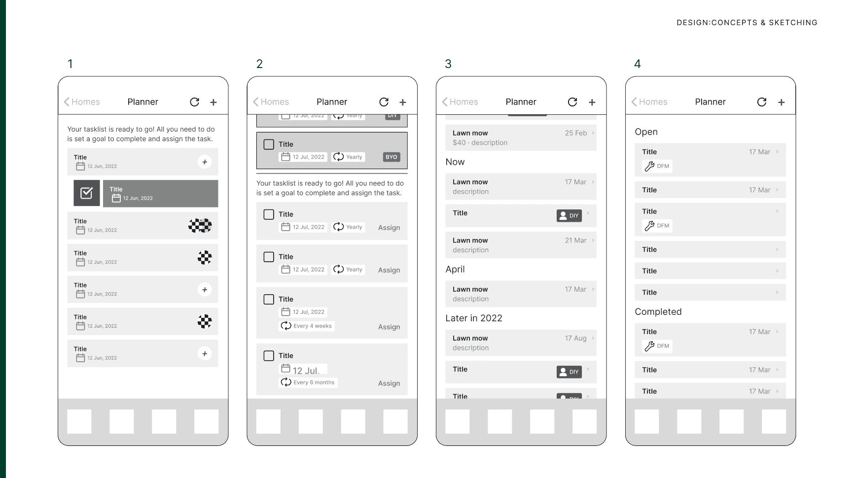 Explored timelines, recurring tasks, and task ownership options through sketches and wireframes, iterating with feedback to create a clear, organised, and adaptable maintenance experience.